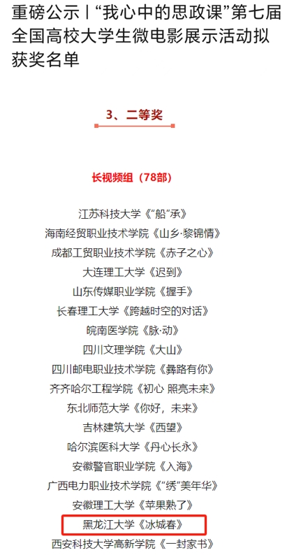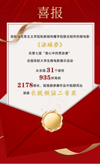 近日,由教育部社会科学司指导,教育部高校思想政治理论课教学指导委员会主办,武汉大学MK体育承办的第七届“我心中的思政课”全国高校老员工微电影展示活动评比结果公布,公司由MK体育和新闻传播公司联合指导的参赛作品《冰城春》荣获长视频组二等奖,这是公司在该项赛事上取得的最好成绩。