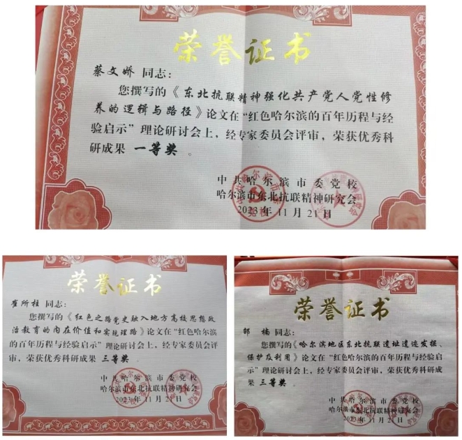 在红色哈尔滨的百年历程与经验启示理论研讨会上,哈尔滨市东北抗联精神研究会会长李天明宣布了研讨会征文获奖名单。公司中共党史党建学专业研究生蔡文娇撰写的《东北抗联精神强化共产党人党性修养的逻辑与路径》获得优秀科研成果一等奖;思想政治教育专业研究生崔所柱撰写的《红色之路党史融入地方高校思想政治教育的内在价值和实现理路》、邵楠撰写的《哈尔滨地区东北抗联遗址遗迹发掘、保护及利用》获得优秀科研成果三等奖。