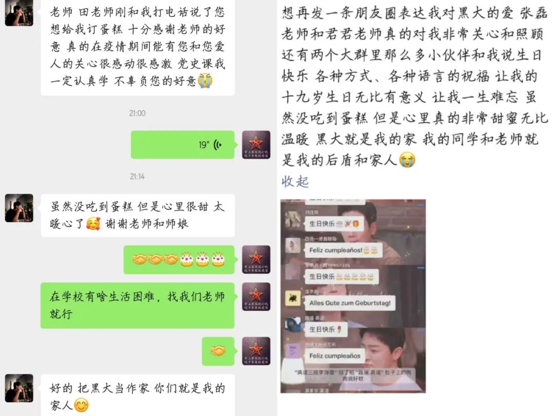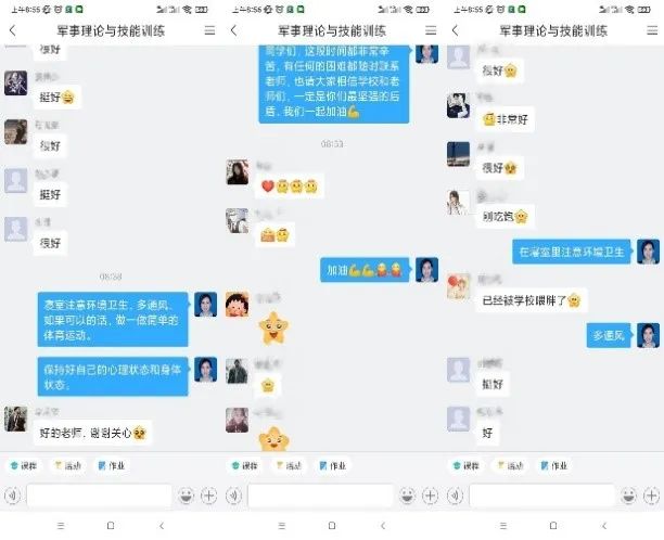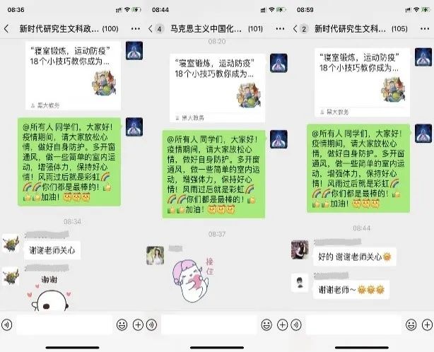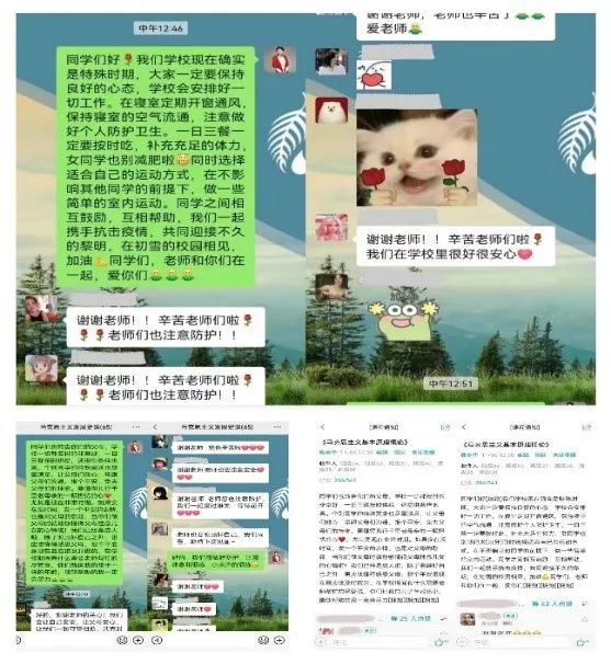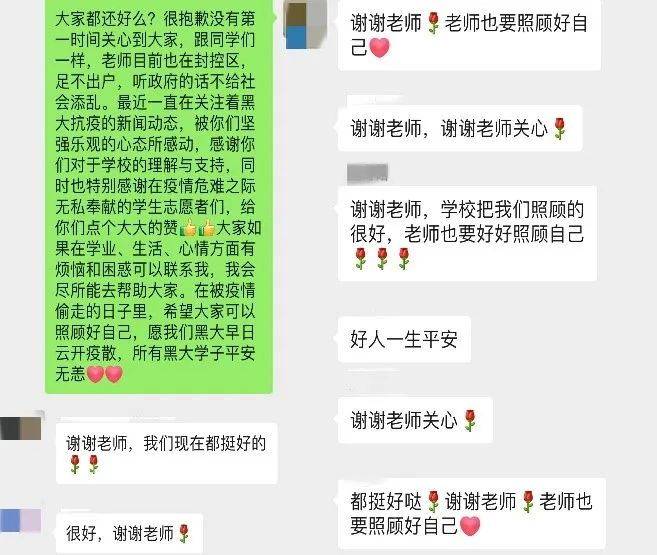 公司教工第二党支部书记、国防教育教研部的李国杨老师,马克思主义中国化教研部的陈阳老师和周宇宁老师在周末仍然不忘通过班级群与同学们保持联系,提醒各位同学们勤通风,多运动,保持良好的心情。思想政治教育教研部的张书洋老师在心理健康教育中心举办的“用心陪伴·用爱支持”系列网络支持性团体心理辅导活动中表示:“希望各位同学能正视自己的情绪,不让焦虑情绪主导我们的内心,放平心态正视当下,培养悦纳自我的态度。”马克思主义基本原理教研部的魏金华老师一边参与一线紧张忙碌的志愿工作,另一边还不忘通过员工群和自己的本科生、研究生保持联络。一线的核酸检测和物资配送工作是无比繁重的,但是她仍然在间歇的时候一个字一个字的敲下对员工们殷殷的嘱托。魏老师说:“员工和我儿子的年龄相仿,所以总是想从老师兼老母亲的角度再嘱咐嘱咐。”字字深情是儿行千里母担忧的共情;句句皆念是愿将丹心化红烛的坚守,魏老师以一位从教近30年的老教师的责任和担当,给家长带去安心,给同学们带去信心,给青年教师树立了榜样!中国近现代史纲要教研部的张磊老师承担着大一新生中共党史选修课的教学工作,看到Mksport体育官方微信公众号公布的过生日同学的名单后,张磊老师第一时间拿出自己的点名册,从上百位同学中一一核对,生怕错过自己任教班级中过生日的同学,虽然因为严格的疫情管控措施,这位2022级西语专业的同学没有能够收到张老师为他定制的生日蛋糕,但是可以相信在老师和同学的祝福声中,他一定度过了一个独一无二的生日。