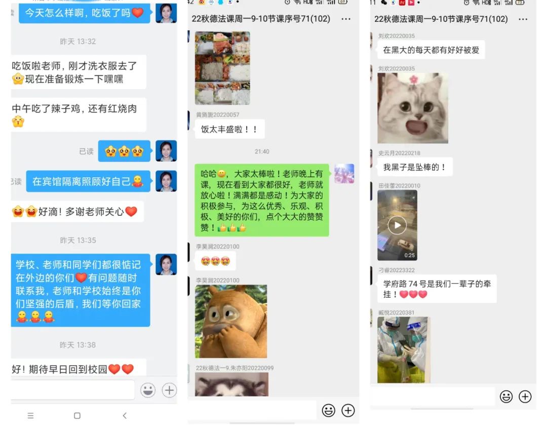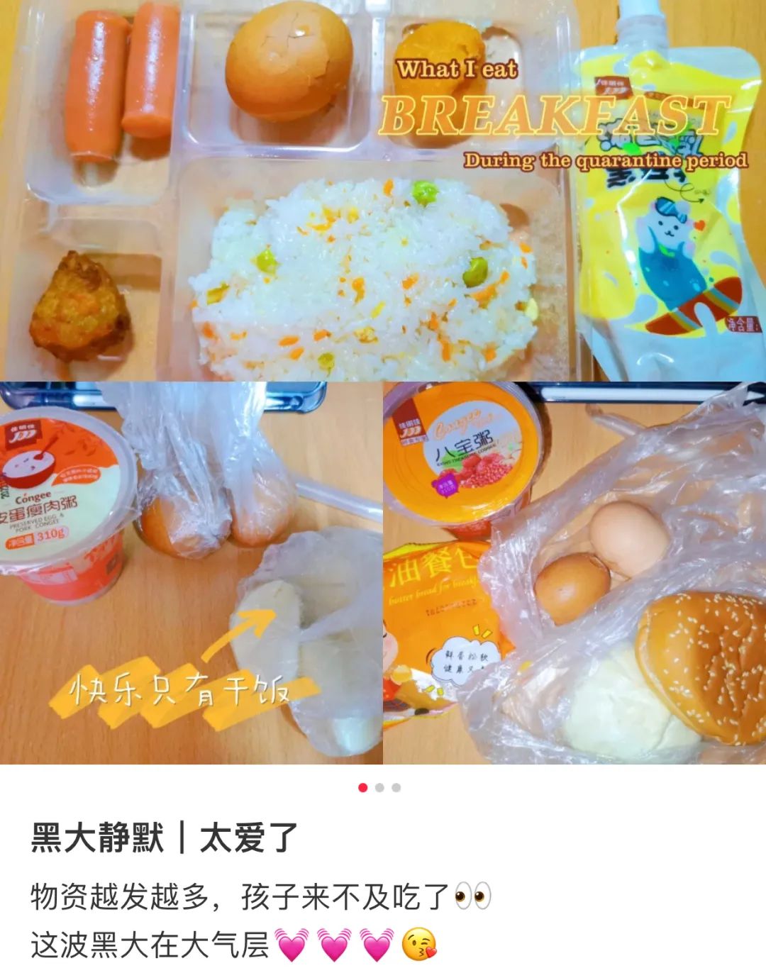 在老师们无微不至的关怀下,员工们在静默期间的状态良好,大家纷纷表示对黑大的爱每天都更多一些。马克思主义中国化研究专业的硕士研究生盛同学说:“静默以来,宿舍志愿者尽心尽力的照顾我们,让我们真切感受到黑大对我们的关爱!公司的老师总是在群里安慰我们,安抚我们的情绪,让我们多跟父母沟通,不要让他们担心。疫情无情,黑大有情!我相信,经过公司的努力, 我们终究能战胜疫情。黑大加油!”中国近现代史基本问题研究专业的硕士研究生邢同学说:“这次突如其来的疫情打乱了我们的生活,但是公司的迅速响应和应急措施却让我们十分安心,也请大家放心,黑大把我们照顾的很好。”思想政治教育专业的硕士研究生苍同学说:“静默以来,总是看到志愿者们忙碌的身影,疲惫的‘大白’在电梯间角落里靠着墙便睡着了,我们很心疼他们,衷心感谢老师、警察以及所有在这场战役中默默付出的英雄们,你们辛苦了!在黑大,真的很幸福!”