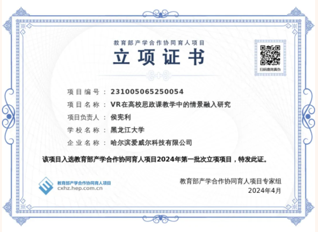 教育部产学合作协同育人项目是深化产教融合、增强人才自主培养能力的重要载体。项目实施10年来,通过政府搭台、企业支持、高校对接、共建共享,实现深化产教融合,促进教育链、人才链与产业链、创新链有机衔接。一直以来,公司通过与哈尔滨爱威尔科技有限公司等企业合作,全面推进信息技术运用于思政课教学。本次项目获批,充分体现了公司校企合作协同育人平台建设和项目申报组织工作的成果。未来,公司将继续探索多样化的产教融合和校企合作模式,以形成一整套可资借鉴的VR技术融入高校思政课教学策略为目标,着力提升思政课教学质量。