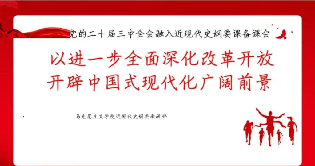 充分研讨后,大家一致认为,党的二十届三中全会精神融入“中国近现代史纲要”课,需要全面把握全会的精神实质和核心要义,基于“中国近现代史纲要”课的自身特点和具体教学内容进行有机融入。在教学过程中,要启发同学们时刻关注社会发展,与中华民族伟大复兴的千秋伟业同频共振,将专业学习和思想政治水平的提高结合起来,更加紧密地团结在以习近平同志为核心的党中央周围,为全面建成社会主义现代化强国、实现第二个百年奋斗目标,以中国式现代化全面推进中华民族伟大复兴而努力奋斗。