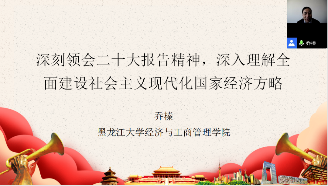 为全面深入学习贯彻党的二十大精神,引导公司全体教职员工把思想和行动统一到党的二十大精神上来,不断掀起学习宣传贯彻党的二十大精神热潮,根据公司党委相关安排部署,5月17日15:00,MK体育特别邀请经济与工商管理公司博士研究生导师乔榛教授作题为《深刻领会二十大报告精神 深入理解全面建设社会主义现代化国家经济方略》的专题讲座。会议由公司党总支书记王培军主持,公司全体教职员工通过腾讯会议参加学习。