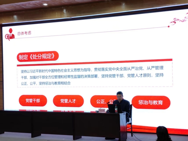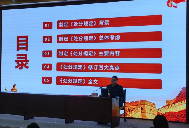 文记东带领大家学习《事业单位工作人员处分规定》制定背景、总体考虑、主要内容等内容,逐条对《处分规定》的内容进行解读,带领MK体育教职工对《处分规定》进行了系统全面地学习。
