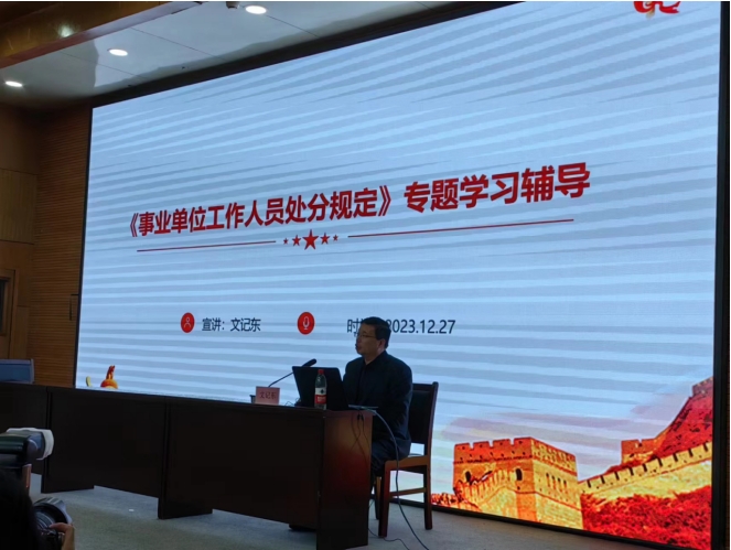 文记东强调《事业单位工作人员处分规定》是完善规定事业单位体系的重要制度,是进一步强化教师职业道德教育的基础。文记东强调指出,《处分规定》立足于适应事业单位人事管理的新要求,着眼于加强对事业单位工作人员的教育、管理和监督,对处分的原则、种类、适用、权限、程序等作出全面规定,是开展事业单位处分工作的基本依据,是完善事业单位人事管理“考、奖、罚”制度体系的重要举措,要把《事业单位工作人员处分规定》贯彻到全院教职工管理环节。