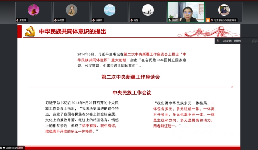 徐雪野从理论层面领学了“铸牢中华民族共同体意识”的内涵,系统讲述了中华民族共同体意识的提出和铸牢中华民族共同体意识的历史意义等相关内容。她认为,中华民族共同体意识的提出,经历了一个在认识上不断深化、在理论上不断完善、在实践中不断发展的过程。习近平总书记将“统一的多民族国家理论”提高到了一个新的层次,形成了“四个共同”理论,这一不断与时俱进的中国化的马克思主义民族理论——铸牢中华民族共同体意识就是建立在“四个共同”这个牢固历史根基上的。习近平总书记关于“铸牢中华民族共同体意识”的重大论断,是我们党民族工作在深厚的历史基础上、复杂的现实条件下作出的重大创新。