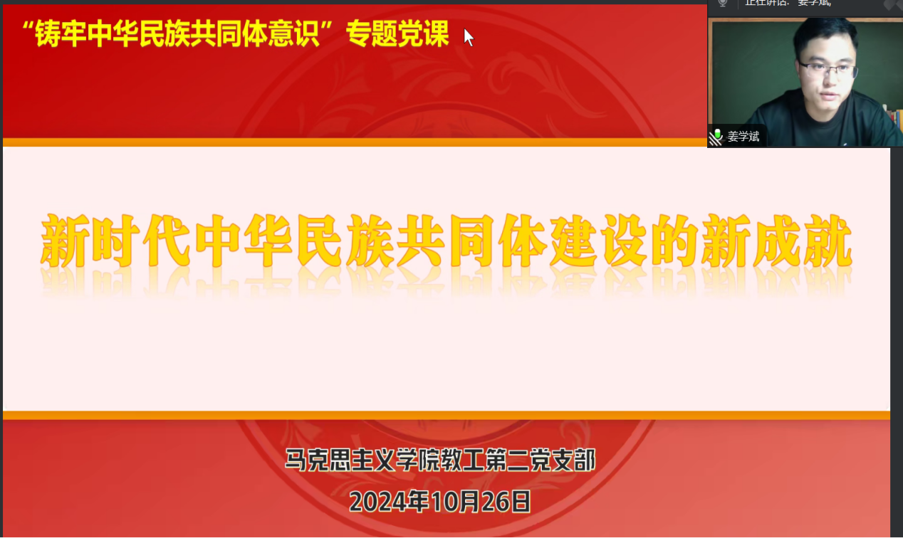 党课上,姜学斌围绕习近平总书记关于加强和改进民族工作的重要思想、中央民族工作会议精神、习近平总书记在中共中央政治局第九次集体学习时的重要讲话精神,从政治、经济、文化、社会和生态文明建设五个方面阐述了铸牢中华民族共同体意识的深刻内涵、精神实质和实践要求,运用生动丰富的语言阐明了中华民族多元一体的大道理,强调了高校教师的职责、任务和要求。讲座内容既有一定的理论高度,也有实践要求,深刻把握了铸牢中华民族共同体意识的历史必然性、极端重要性和现实针对性,使全体党员深受启发和教育,为高举中华民族大团结旗帜,促进各民族交往交流交融,像石榴子一样紧紧抱在一起,实现“五个认同”和中华民族伟大复兴,奋力书写新时代各民族共同发展的新篇章创造了坚实的基础。
